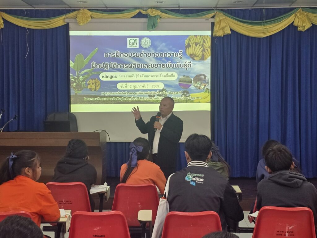 วันที่ 12 กุมภาพันธ์ 2569 ศูนย์ขยายพันธุ์พืชที่ 10 จังหวัดอุดรธานี จัดฝึกอบรมถ่ายทอดความรู้ฝึกปฏิบัติการผลิตและขยายพืชพันธุ์ดี หลักสูตร การขยายพันธุ์พืชด้วยการเพาะเลี้ยงเนื้อเยื่อ ให้นักเรียนชั้นมัธยมศึกษาปีที่ 3 โรงเรียนอนุบาลหนองวัวซอ อำเภอหนองวัวซอ จังหวัดอุดรธานี ณ จุดบริการพืชพันธุ์Doae ศูนย์ขยายพันธุ์พืชที่ 10 จังหวัดอุดรธานี ลิงค์เพิ่มเติม