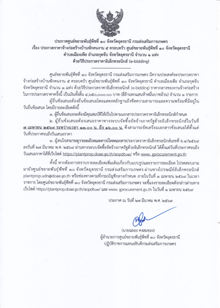 ประกาศศูนย์ขยายพันธุ์พืชที่ 10 จังหวัดอุดรธานี เรื่อง ประกวดราคาจ้างก่อสร้างบ้านพักคนงาน 5 ครอบครัว ศูนย์ขยายพันธุ์พืชที่ 10 จังหวัดอุดรธานี ตำบลเมืองเพีย อำเภอกุดจับ จังหวัดอุดรธานี ด้วยวิธีประกวดราคาอิเล็กทรอนิกส์ (e-bidding) เลขที่โครงการ 68109457804